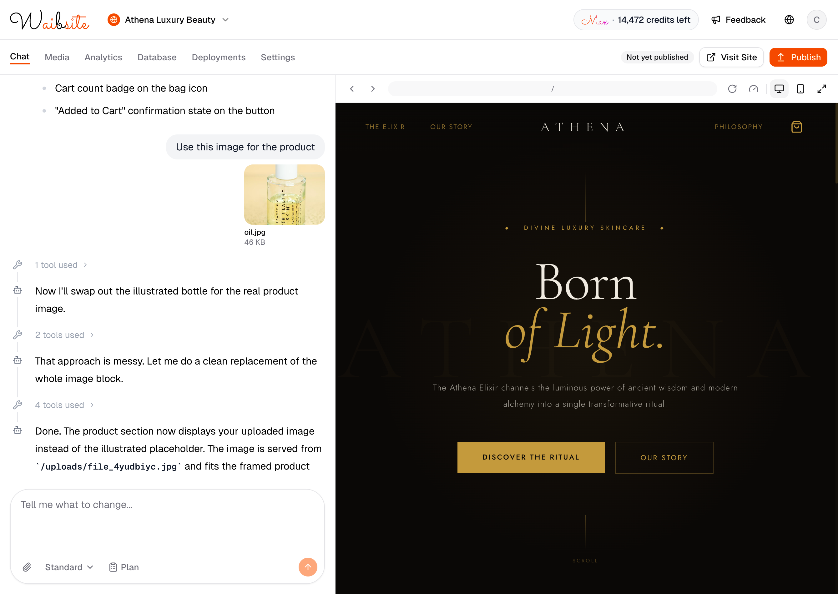 Simply chat with our AI to create your website. See changes in real-time with a live preview on the right and chat interface on the left.